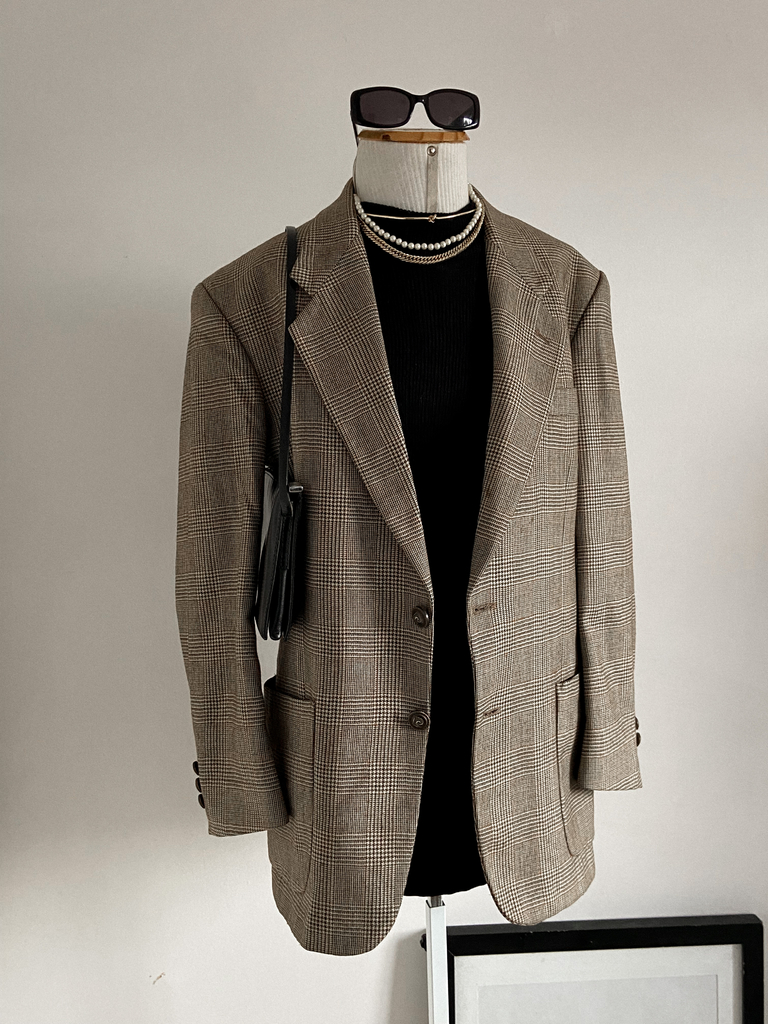cor marrom claro estampa xadrez cgc tecido poliéster e lã forro poliamida medidas ombro 44cm busto 114cm manga 60cm comprimento 79cm