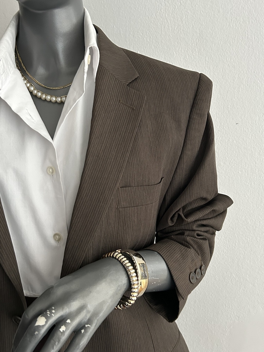 Apresentamos o Blazer Makenji Classic, uma peça que une sofisticação e estilo clássico com um toque moderno. Na elegante cor marrom com subtom esverdeado, este blazer traz riscas discretas que enriquecem seu design, perfeito para quem busca uma presença marcante e refinada.