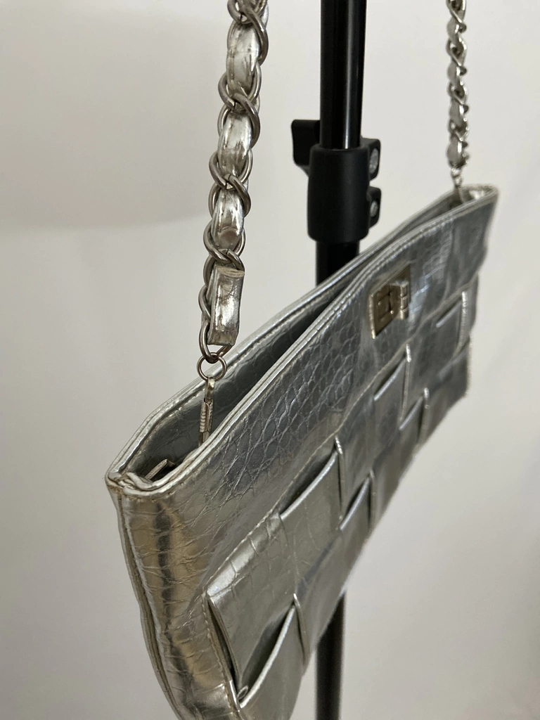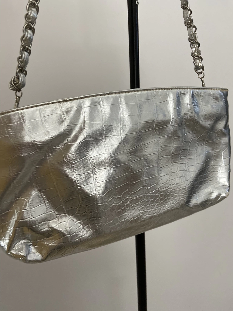 cor prateada material couro sintético medidas comprimento 31cm altura sem alça 17cm altura com alça 44cm largura 4cm