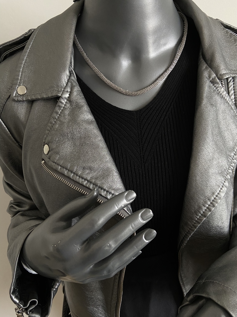 cor prata reluzente material poliuretano forro poliéster estilo perfect medidas ombro 41cm busto98cm manga 61cm comprimento 50cm